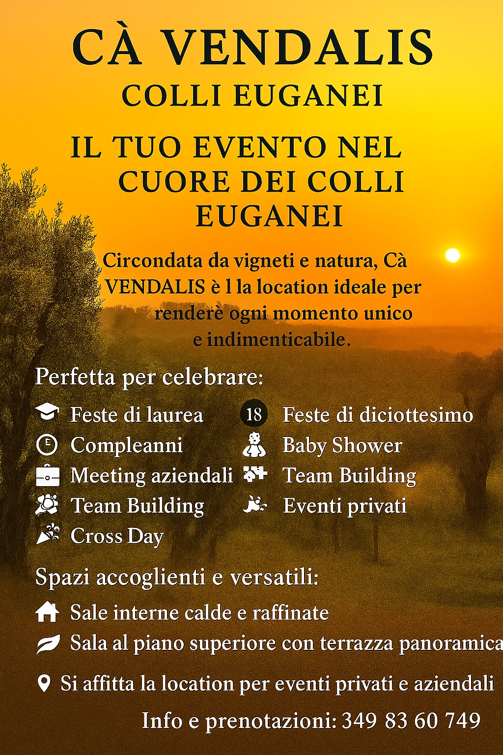Immerso nella magia dei Colli Euganei, Cà Vendalis è il luogo perfetto per celebrare ciò che conta davvero. Che si tratti di un compleanno speciale, una laurea tanto attesa, un battesimo emozionante o il giorno del tuo “sì”, qui ogni evento prende vita in un’atmosfera unica, avvolta dalla bellezza del tramonto e dal calore dell’ospitalità.