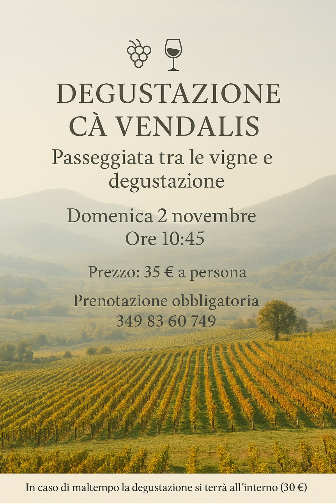 Domenica 2 novembre alle ore 10:45 ti invitiamo a vivere un’esperienza immersiva tra i filari dei Colli Euganei, nel cuore della nostra tenuta Cà Vendalis.